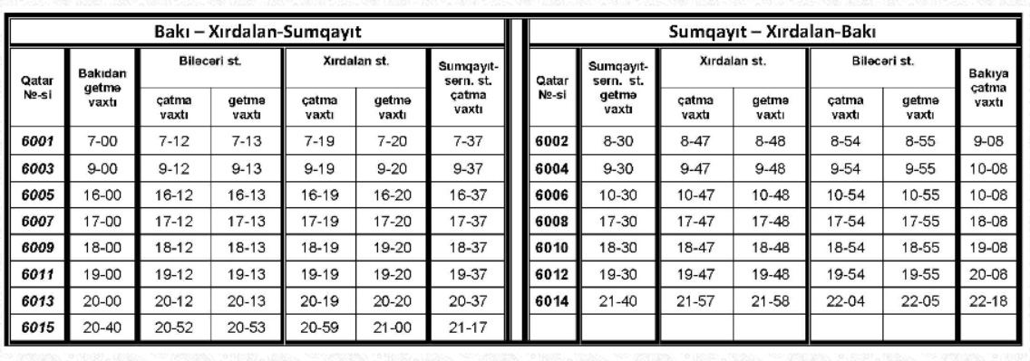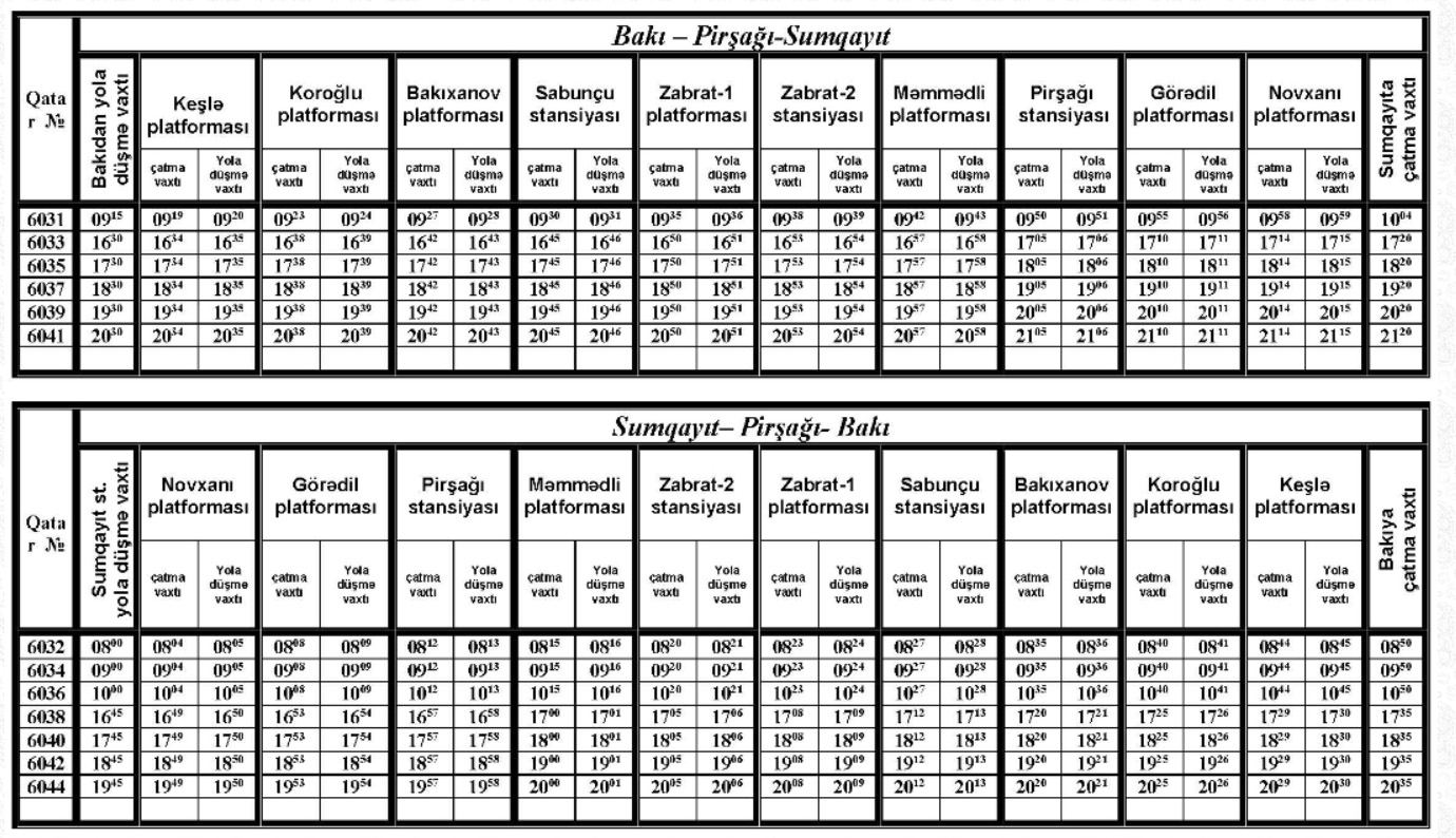 Qatarların hərəkət qrafiki və tariflərlə daha ətraflı aşağıdakı cədvəllərdə tanış ola bilərsiniz.