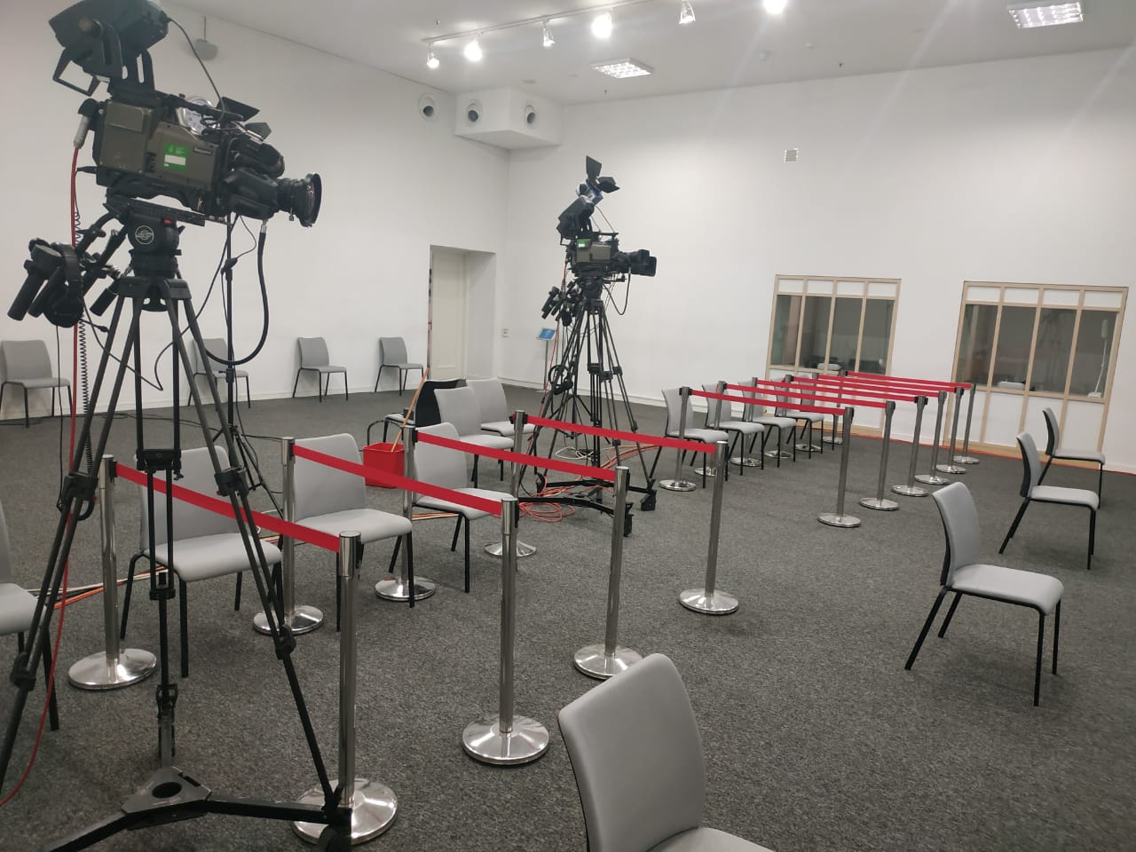 Brifinqə dəvət olunanların çıxışlarının, həmçinin KİV təmsilçilərinin sullarının verilməsinin zalın hər iki hissəsində yayımlanması üçün xüsusi monitorlardan və texnikadan istifadə olunur. Brifinqlərə dəvət olunan bütün şəxslərə məkana girişdə qoruyucu tibbi maskalar, əlcəklər təqdim edilir, zalda dezinfeksiya məhlulları qoyulur. Məkana daxil olan şəxslərin girişdə bədən hərarəti ölçülür. Zaldakı oturacaqlar brifinqdə həm KİV qarşısında çıxış edənlər, həm də media təmsilçiləri arasında müvafiq məsafə tələbinə riayət olunmaqla yerləşdirilir. Həmin oturacaqların arxasında dayanan, canlı yayımı və jurnalistlərin reportajları üçün lazım kadrların alınmasını təmin edən videoçəkiliş qrupları arasında da məsafənin gözlənilməsi üçün şərait yaradılıb. Belə ki, hər bir operator üçün yerlər xüsusi lentlərlə ayrılıb.