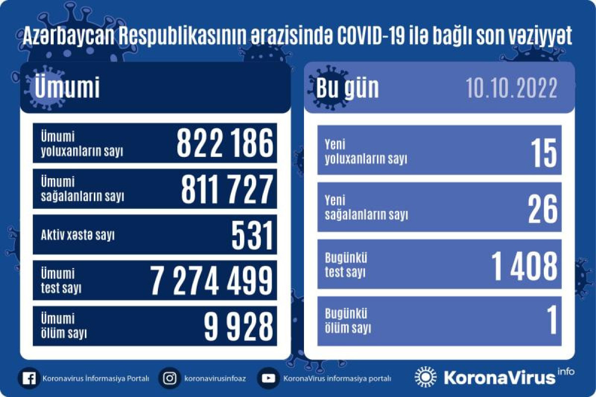 Son sutka ərzində yeni yoluxma hallarının müəyyənləşdirilməsi ilə əlaqədar 1408, ümumilikdə isə 7 274 499 test icra olunub.