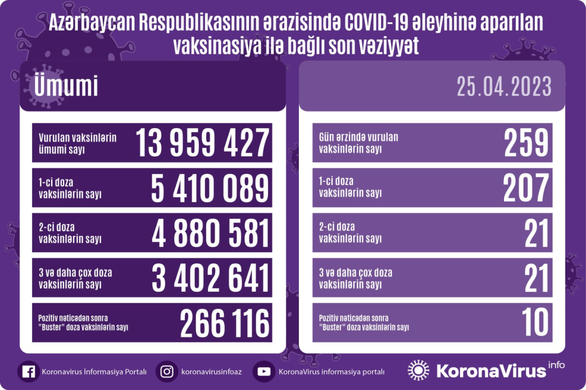 Vurulan vaksinlərin ümumi sayı 13 959 427, birinci mərhələ üzrə vaksinasiya olunanların ümumi sayı 5 410 089, ikinci mərhələ üzrə vaksinasiya olunanların sayı 4 880 581, üç və daha çox doza üzrə vaksinasiya olunanların sayı 3 402 641, pozitiv nəticədən sonra buster doza üzrə vaksinasiya olunanların sayı isə 266 116 nəfər təşkil edir.