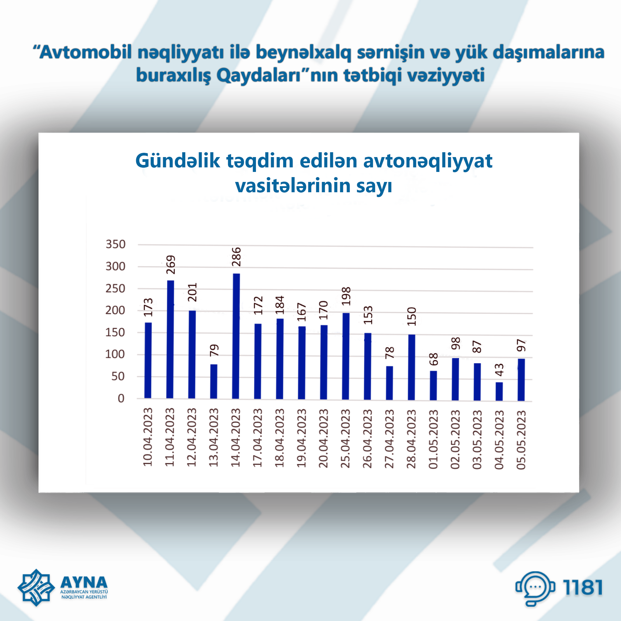Nazirlər Kabineti tərəfindən təsdiqlənən “Avtomobil nəqliyyatı ilə beynəlxalq sərnişin və yük daşımalarına buraxılış Qaydaları”nın tətbiqindən bir ay ötür. Bu vaxta kimi “Buraxılış vəsiqəsi” və “Buraxılış kartı” almaq üçün 934 daşıyıcı 6128 nəqliyyat vasitəsilə müraciət edib. Sənədləri buraxılış qaydalarının şərtlərinə uyğun olan 889 daşıyıcıya “Buraxılış vəsiqəsi” təqdim olunub. “Buraxılış kartı” alan nəqliyyat vasitələrinin sayı isə 5863-dür.