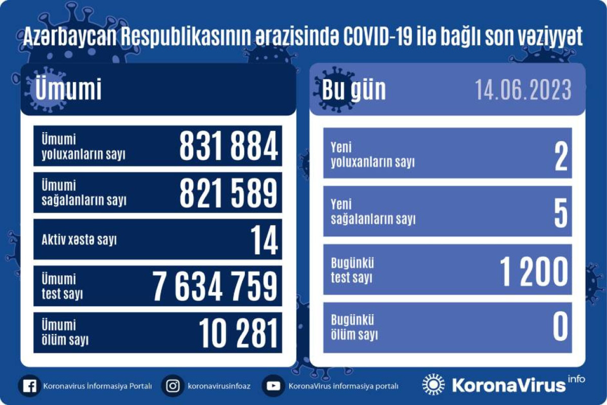 Azərbaycanda indiyədək ümumilikdə 831 884 nəfərin koronavirus infeksiyasına yoluxması faktı müəyyən edilib. Onlardan 821 589 nəfər müalicə olunaraq sağalıb, 10 281 nəfər vəfat edib, aktiv xəstə sayı 14 nəfərdir.
