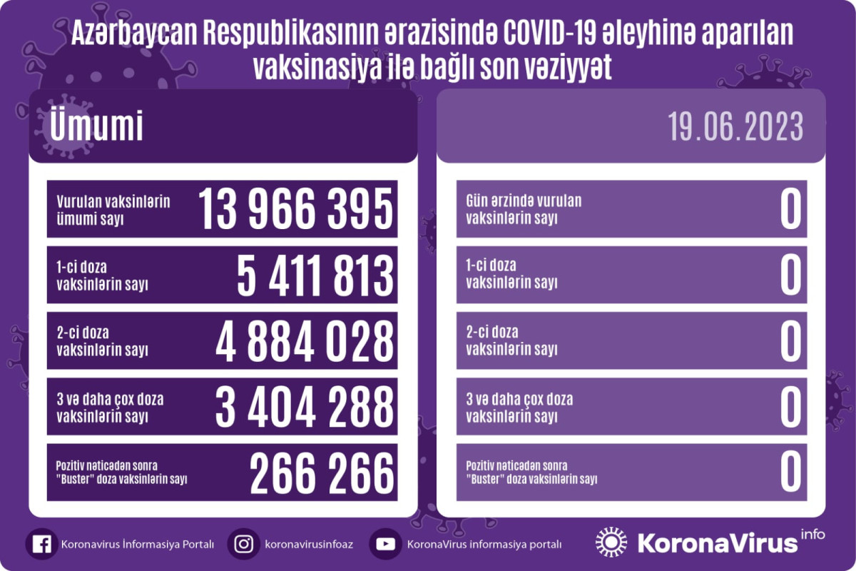 Vurulan vaksinlərin ümumi sayı 13 966 395, birinci mərhələ üzrə vaksinasiya olunanların ümumi sayı 5 411 813, ikinci mərhələ üzrə vaksinasiya olunanların sayı 4 884 028, üç və daha çox doza üzrə vaksinasiya olunanların sayı 3 404 288, pozitiv nəticədən sonra buster doza üzrə vaksinasiya olunanların sayı isə 266 266 nəfər təşkil edir.