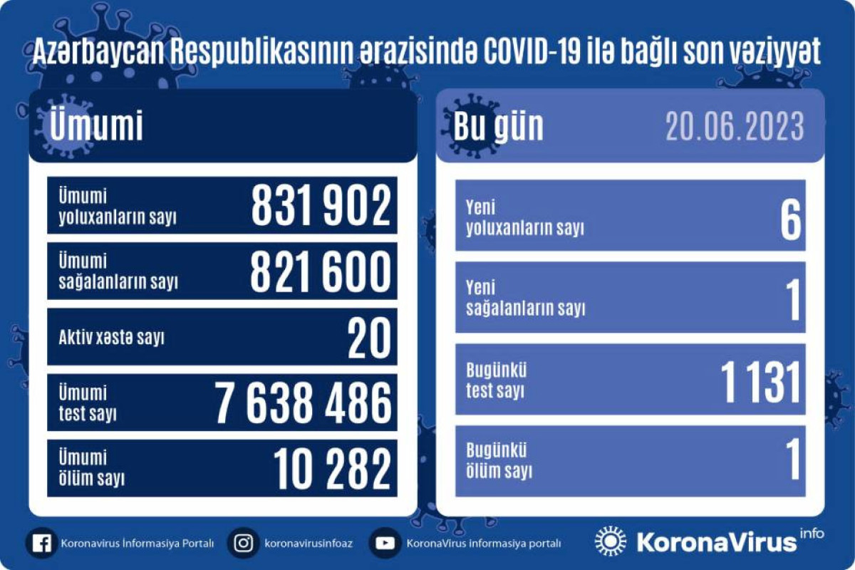 Azərbaycanda koronavirus (COVID-19) infeksiyasına 6 yeni yoluxma faktı qeydə alınıb, 1 nəfər müalicə olunaraq sağalıb.