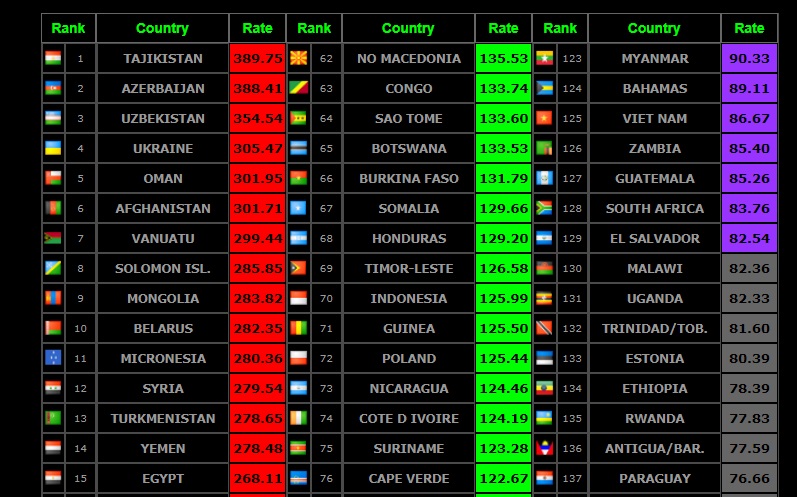 Siyahıda üçüncü Özbəkistan, dördüncü Ukraynadır. Qafqaz ölkələrindən Gürcüstan 24-cü, Ermənistan isə 28-ci yerdədir.
