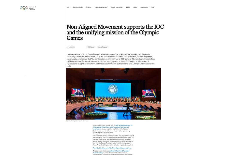 Beynəlxalq Olimpiya Komitəsi (BOK) Azərbaycanın sədrlik etdiyi və BMT-nin 193 üzv dövlətindən 120-ni birləşdirən Qoşulmama Hərəkatının Bakıda qəbul olunan Bəyannaməsini alqışlayıb.