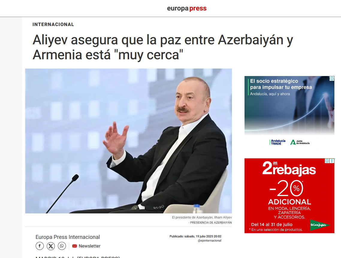 İspaniyanın geniş oxucu kütləsinə malik “Europapress”, “Democrata”, Teleprensa”, “Upday” mətbuat orqanlarında dərc olunan materiallarda Prezident İlham Əliyevin Azərbaycan ilə Ermənistan arasında sülh sazişinin imzalanması, Zəngəzur dəhlizinin açılması ilə bağlı fikirlərinə geniş yer ayrılıb. İspan mediası diqqətə çatdırıb ki, Azərbaycanın dövlət başçısı ölkəsinin Ermənistan ilə sülhə yaxın olduğunu bildirib, amma İrəvanın bu prosesdə daha konstruktiv rol oynamasının, eyni zamanda, kommunikasiyaların açılması istiqamətində müsbət addımlar atmasının zəruriliyini vurğulayıb.