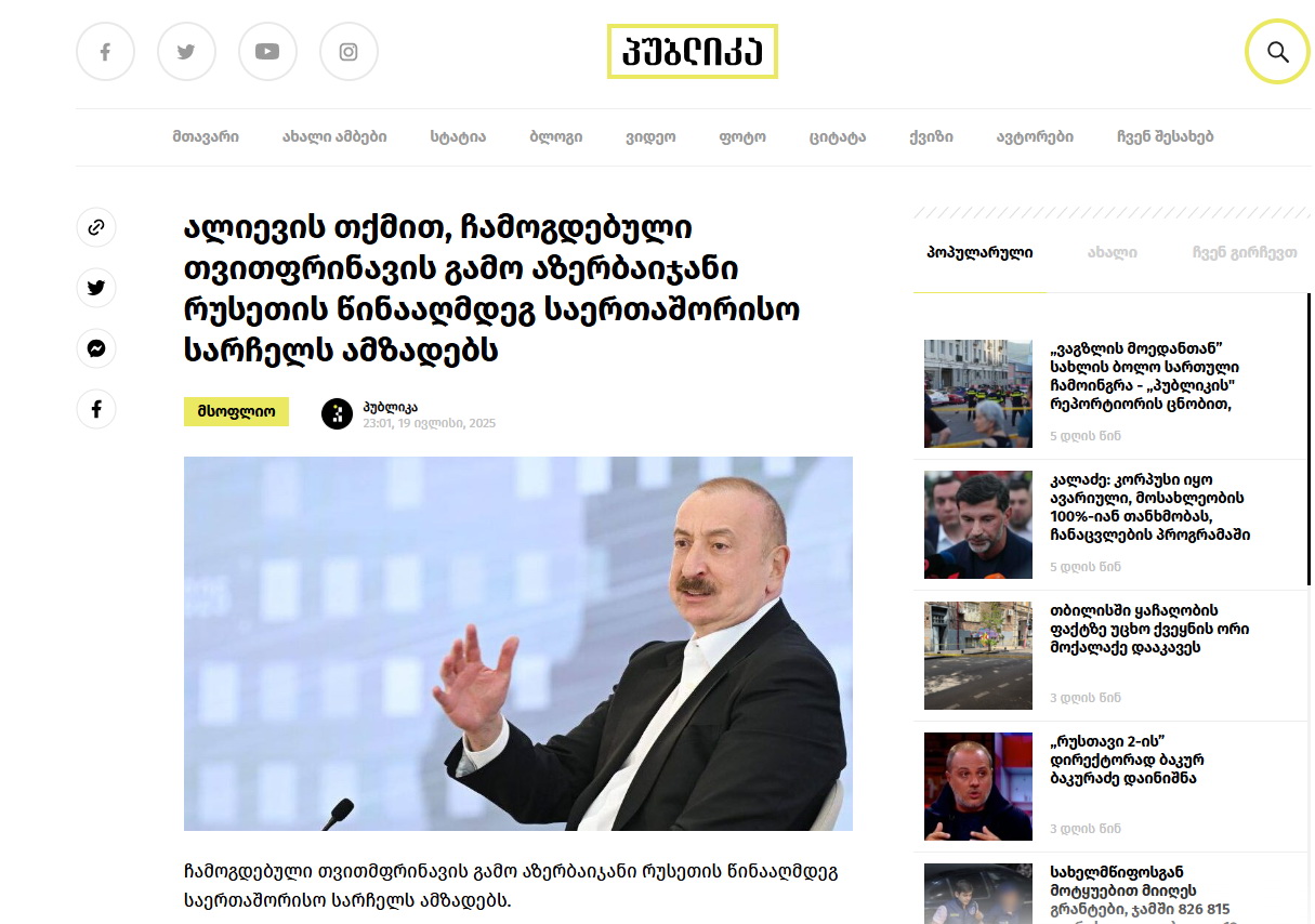 Gürcüstanın “Publica.ge”, “Formula”, “Press.ge”, “İnterpress” mətbuat orqanlarında dərc olunan materiallarda Prezident İlham Əliyevin AZAL-ın təyyarəsi ilə bağlı insident, Ermənistanla sülh prosesi, Cənubi Qafqazda sülhün və təhlükəsizliyin bərqərar olması və kommunikasiyaların açılması ilə bağlı fikirləri yer alıb.