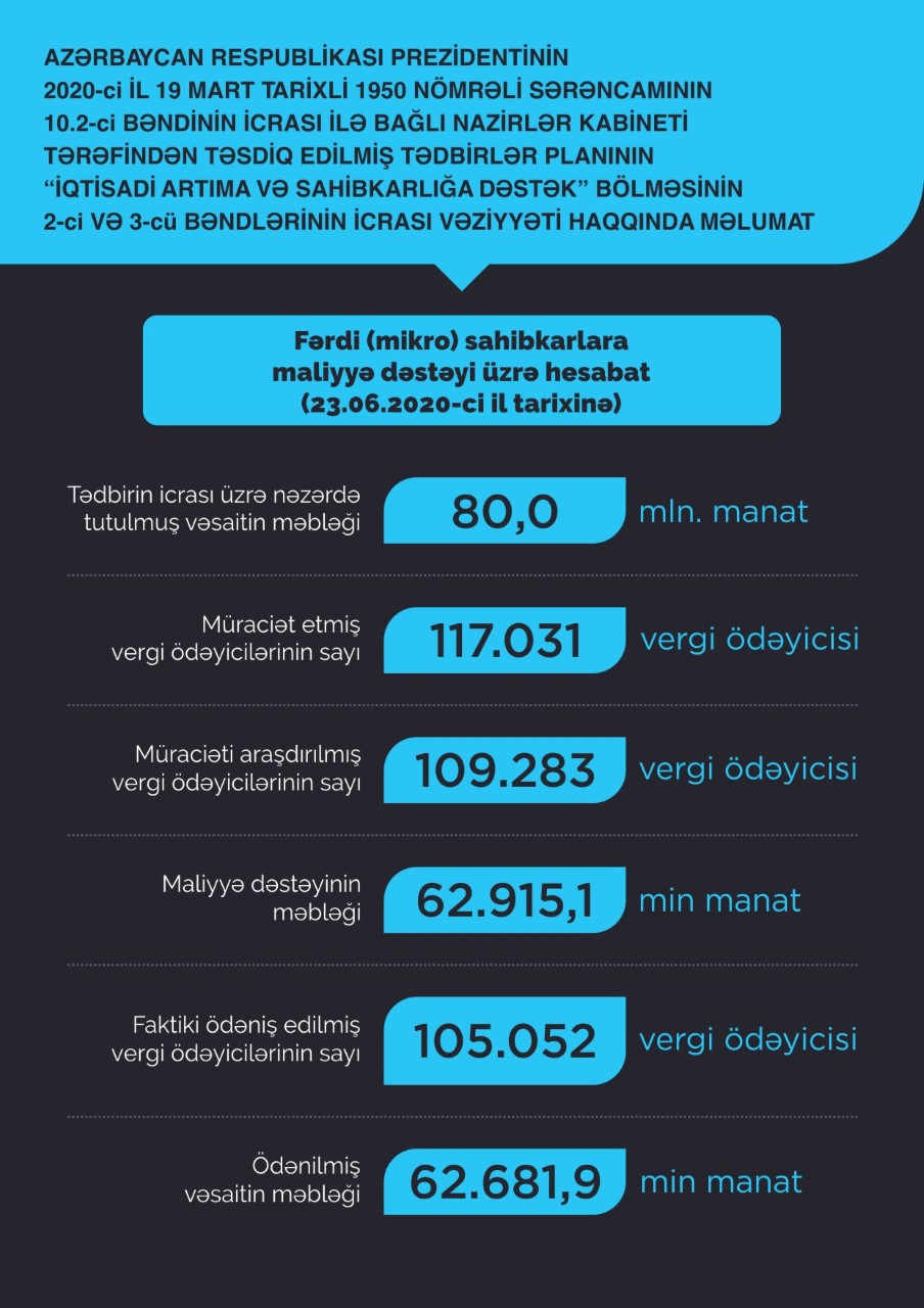 Fərdi (mikro) sahibkarlara maliyyə dəstəyinin göstərilməsi proqramı çərçivəsində 117.031 vergi ödəyicisindən müraciət daxil olub, 109.283 müraciət araşdırılaraq təsdiqlənib və maliyyə dəstəyinin bank hesablarına köçürülməsi üçün Maliyyə Nazirliyinə təqdim edilib. Təsdiq edilmiş müraciətlər üzrə maliyyə dəstəyinin həcmi 62,91 mln. manat təşkil edir. İyunun 23-nə Maliyyə Nazirliyinin Dövlət Xəzinədarlıq Agentliyi tərəfindən artıq 62,68 mln. manat vəsaitin 105.052 fərdi (mikro) sahibkarın bank hesablarına köçürülməsi təmin edilib.