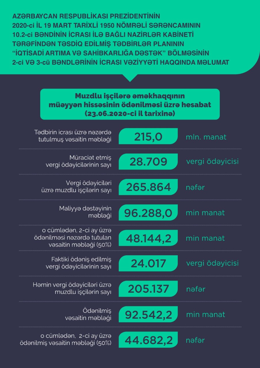 Azərbaycan Prezidentinin 2020-ci il 19 mart tarixli Sərəncamının 10.2-ci bəndinin icrası ilə bağlı Nazirlər Kabineti tərəfindən təsdiq edilmiş Tədbirlər Planına əsasən, 23 iyun tarixinə İqtisadiyyat Nazirliyinə muzdlu işçilərin əməkhaqqının müəyyən hissəsinin ödənilməsi üçün koronavirus (COVİD-19) pandemiyasından zərər çəkmiş 28.709 vergi ödəyicisi və maliyyə dəstəyi almaq üçün 117.031 fərdi (mikro) sahibkar, cəmi 145.740 vergi ödəyicisi müraciət edib.