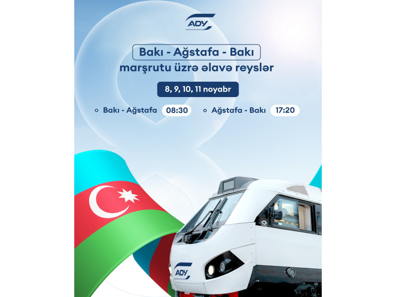 "Azərbaycan Dəmir Yolları" QSC (ADY) Zəfər Günü ilə əlaqədar 8, 9, 10 və 11 noyabrda Bakı-Ağstafa-Bakı xətti üzrə hər iki istiqamətdə əlavə qatar reysləri təyin edib.