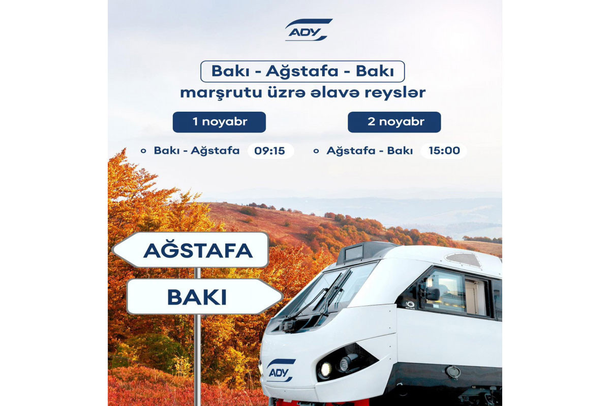 "Azərbaycan Dəmir Yolları" QSC (ADY) artan sərnişin tələbatını təmin etmək məqsədilə 1 noyabrda Bakı-Ağstafa, 2 noyabrda isə Ağstafa-Bakı istiqamətində əlavə qatar reysləri təyin edib.