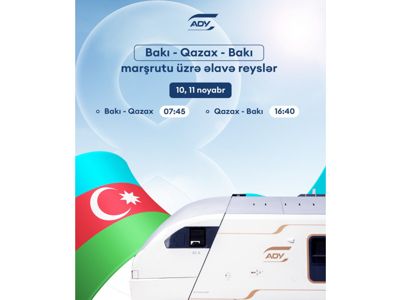 Zəfər və Bayraq günləri ilə əlaqədar 10 və 11 noyabr tarixlərinin istirahət günü elan olunmasını nəzərə alaraq, "Azərbaycan Dəmir Yolları" QSC (ADY) Bakı-Qazax-Bakı marşrutu ilə hər iki istiqamətə əlavə reyslər təyin edib.