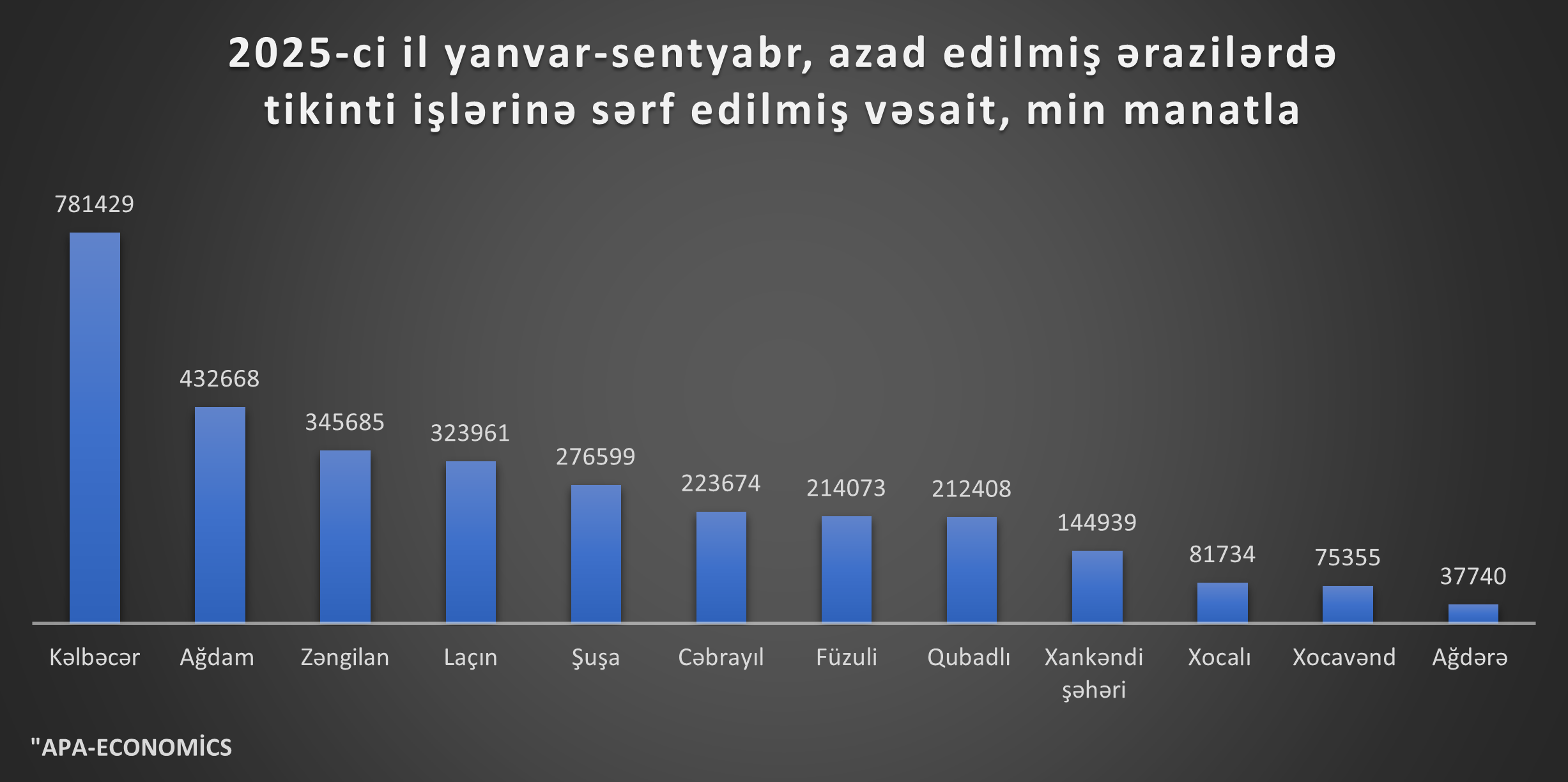 İşğaldan azad edilmiş rayonlarda tikinti-quraşdırma işlərinə 2025-ci ilin yanvar-sentyabr ayları ərzində bütün maliyyə mənbələri hesabına 3 milyard 150 milyon 268 min manat vəsait sərf edilib.