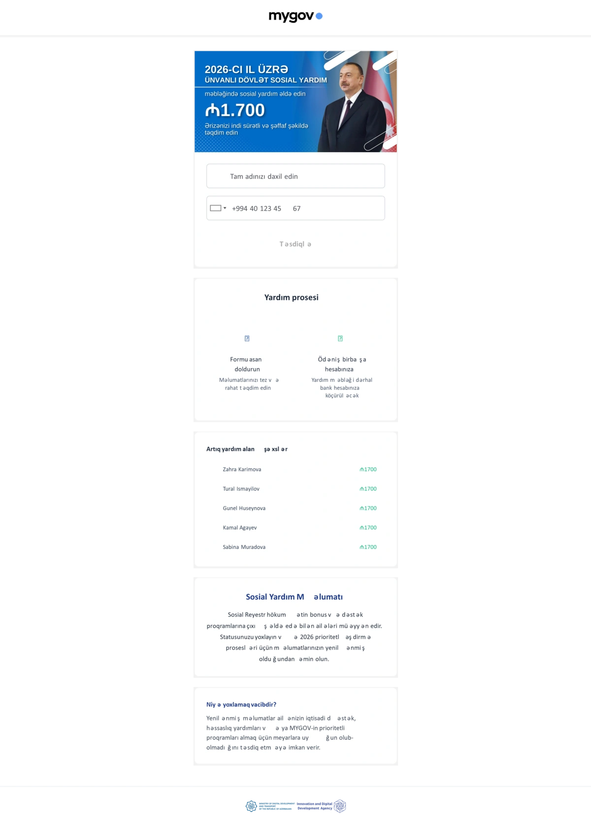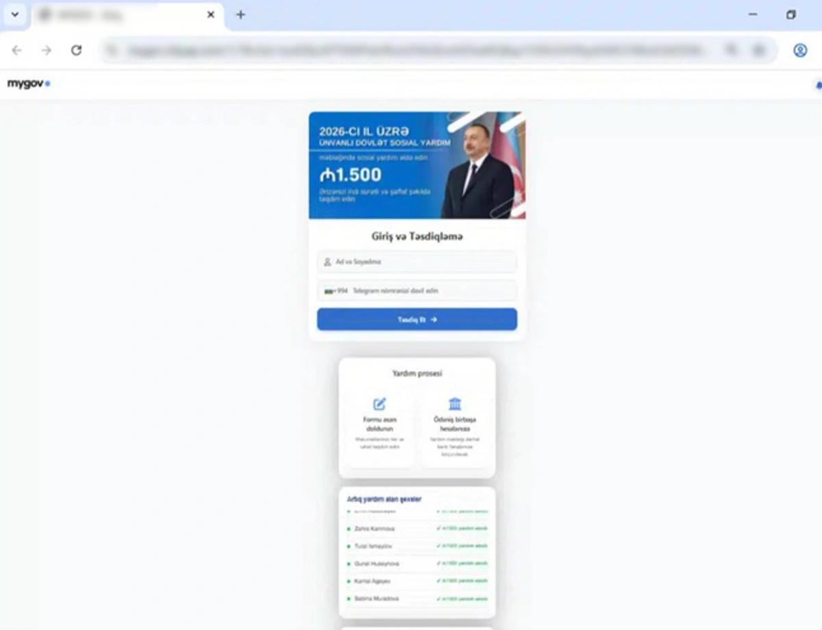 Son günlərdə fişinq xarakterli müxtəlif saxta domenlər yaradılaraq sosial şəbəkələr və messengerlər vasitəsilə əhali arasında dövlət tərəfindən ünvanlı sosial yardımların verilməsi ilə bağlı dezinformasiya yayılmaqdadır.