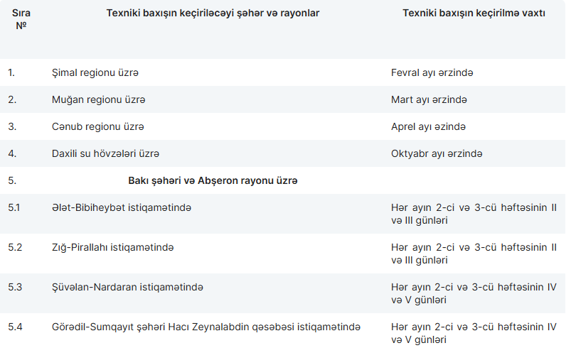 Texniki baxış aşağıdakı cədvələ uyğun keçiriləcək: