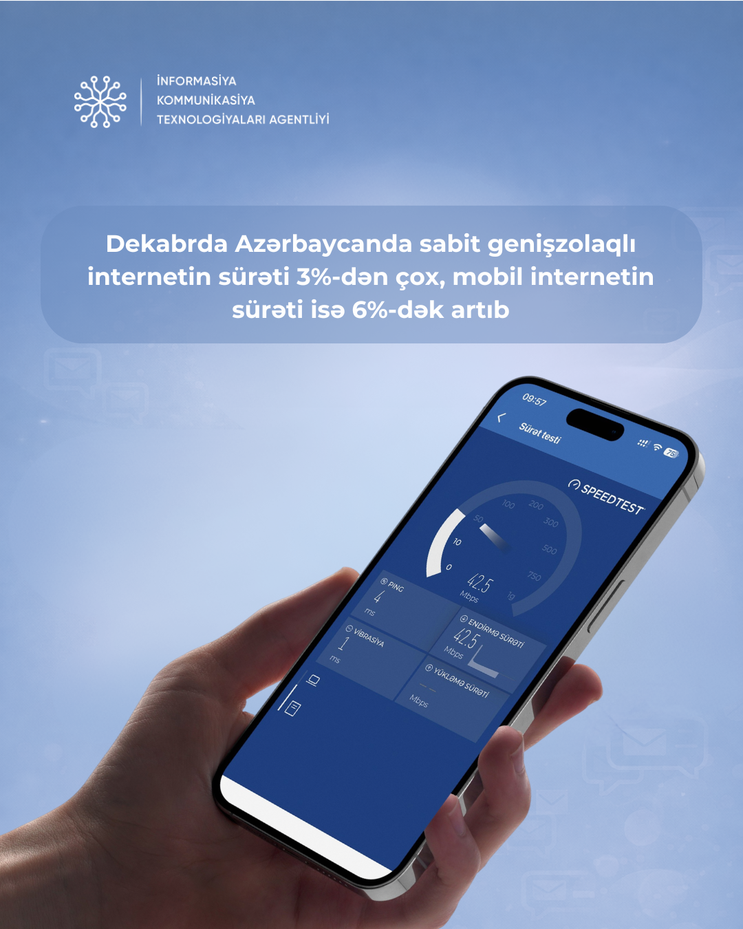 Noyabr ayı ilə müqayisədə sabit genişzolaqlı internetin həcmi 2,68 MB/s və ya 3,11%, mobil internetin sürəti isə 4,55 Mb/s və ya 5,46% yüksəlib.