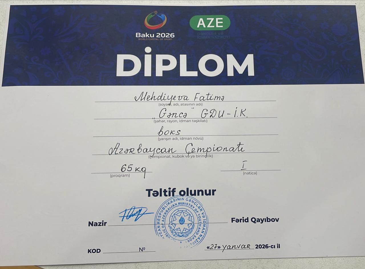 Gəncə Dövlət Universitetinin (GDU) tələbəsi, GDU İdman Klubunun yetirməsi Fatimə Mehdiyeva qadın boksçular arasında keçirilən Azərbaycan çempionatında yarışın qalibi olub.