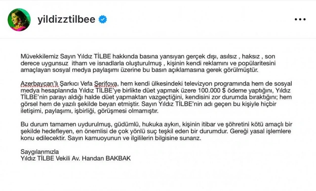 O bildirib ki, Yıldız Tilbe haqqında mətbuatda çıxan əsassız məlumatlar səbəbi ilə məhkəməyə müraciət olunacaq.