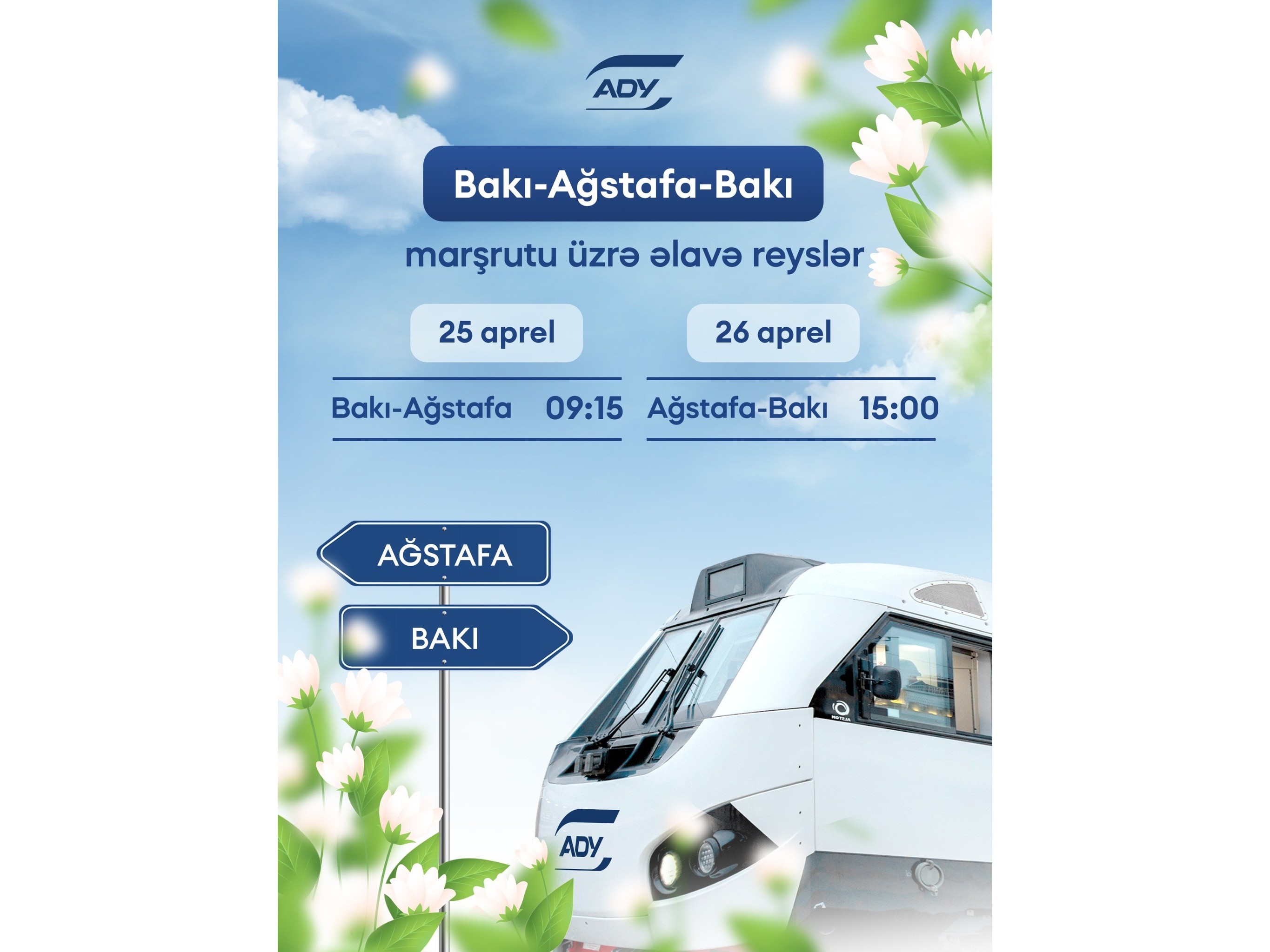 "Azərbaycan Dəmir Yolları" QSC (ADY) sərnişin tələbatını təmin etmək məqsədilə 25 və 26 aprel tarixlərində Bakı-Ağstafa-Bakı marşrutu üzrə əlavə reyslər təyin edib.
