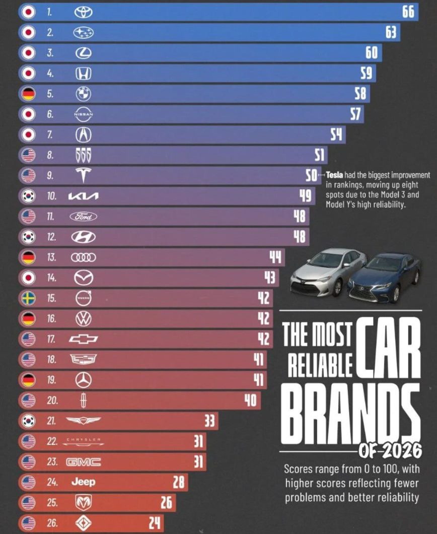 2026-cı il üçün ən etibarlı avtomobil brendləri reytinqində ilk 7 yerdən 6-sında Yaponiya brendləri yer alıb.