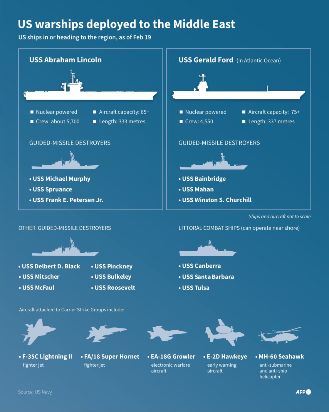 Hərbi baxımdan isə ABŞ bölgədə qüvvələrini sürətlə artırır. Son günlər ərzində Yaxın Şərqə onlarla hərbi-nəqliyyat təyyarəsi, yanacaqdaşıyan KC-135 və KC-46 təyyarələri, həmçinin F-22, F-15 və F-16 qırıcıları göndərilib. ABŞ-ın “USS Abraham Lincoln” aviadaşıyıcısı artıq bölgədədir, “USS Gerald R. Ford” isə Aralıq dənizinə daxil olaraq Yaxın Şərq istiqamətində irəliləyir. Ekspertlər bu miqyaslı cəmləşmənin uzunmüddətli hərbi kampaniya üçün zəruri infrastruktur yaratdığını bildirirlər.