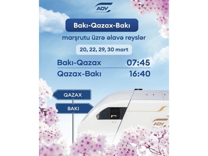"Azərbaycan Dəmir Yolları" QSC (ADY) qarşıdan gələn bayram günlərində sərnişin tələbatını təmin etmək məqsədilə Bakı-Qazax-Bakı marşrutu üzrə əlavə qatar reysləri təyin edib.