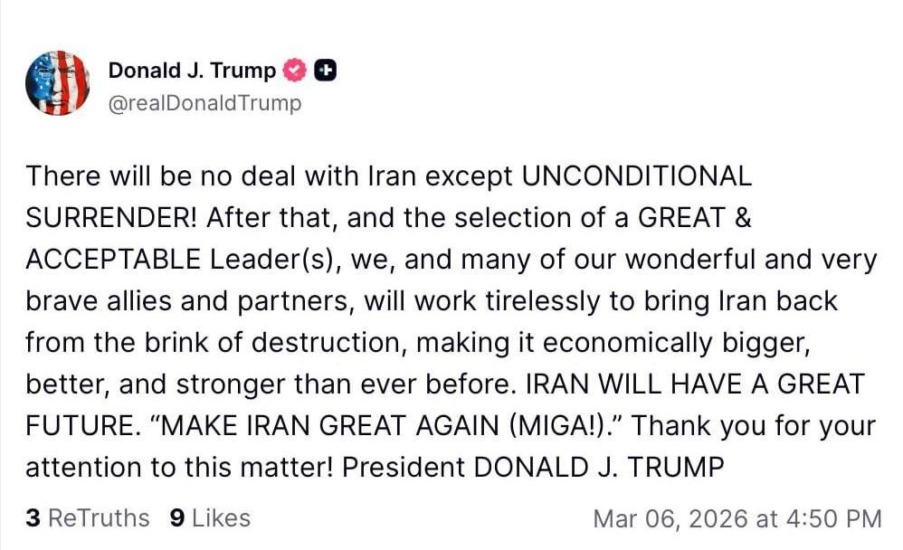 "İranla qeyd-şərtsiz kapitulyasiyadan başqa heç bir razılaşma olmayacaq! Bundan sonra və layiqli lider(lər)in seçilməsindən sonra biz və bir çox müttəfiqlərimiz, tərəfdaşlarımız İranı məhv olmaq astanasından geri çəkmək üçün yorulmadan çalışacağıq, onu iqtisadi cəhətdən əvvəlkindən daha böyük, yaxşı və güclü edəcəyik. İranın böyük gələcəyi olacaq. "İranı yenidən böyük edək (MIGA!)". Bu məsələyə diqqətiniz üçün təşəkkür edirəm!", - o vurğulayıb.