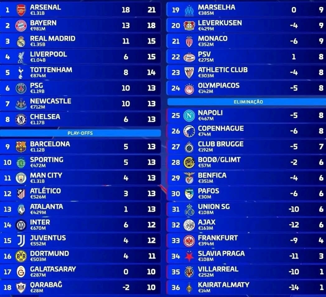 Xatırladaq ki, ÇL-in Liqa mərhələsində ilk 8 yeri tutan komanda birbaşa 1/8 finala, 9-24-cü yeri tutanlar isə pley-off mərhələsinə vəsiqə qazanır.