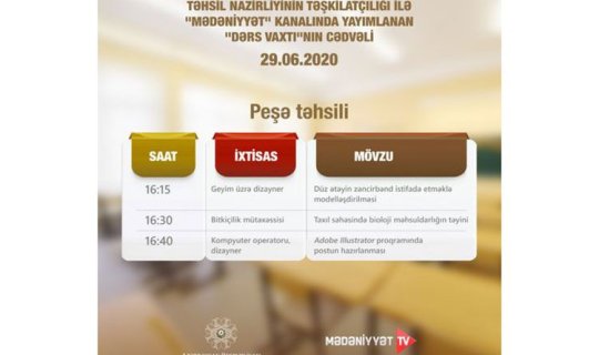 Peşə təhsili üzrə teledərslərin sabaha olan cədvəli açıqlandı