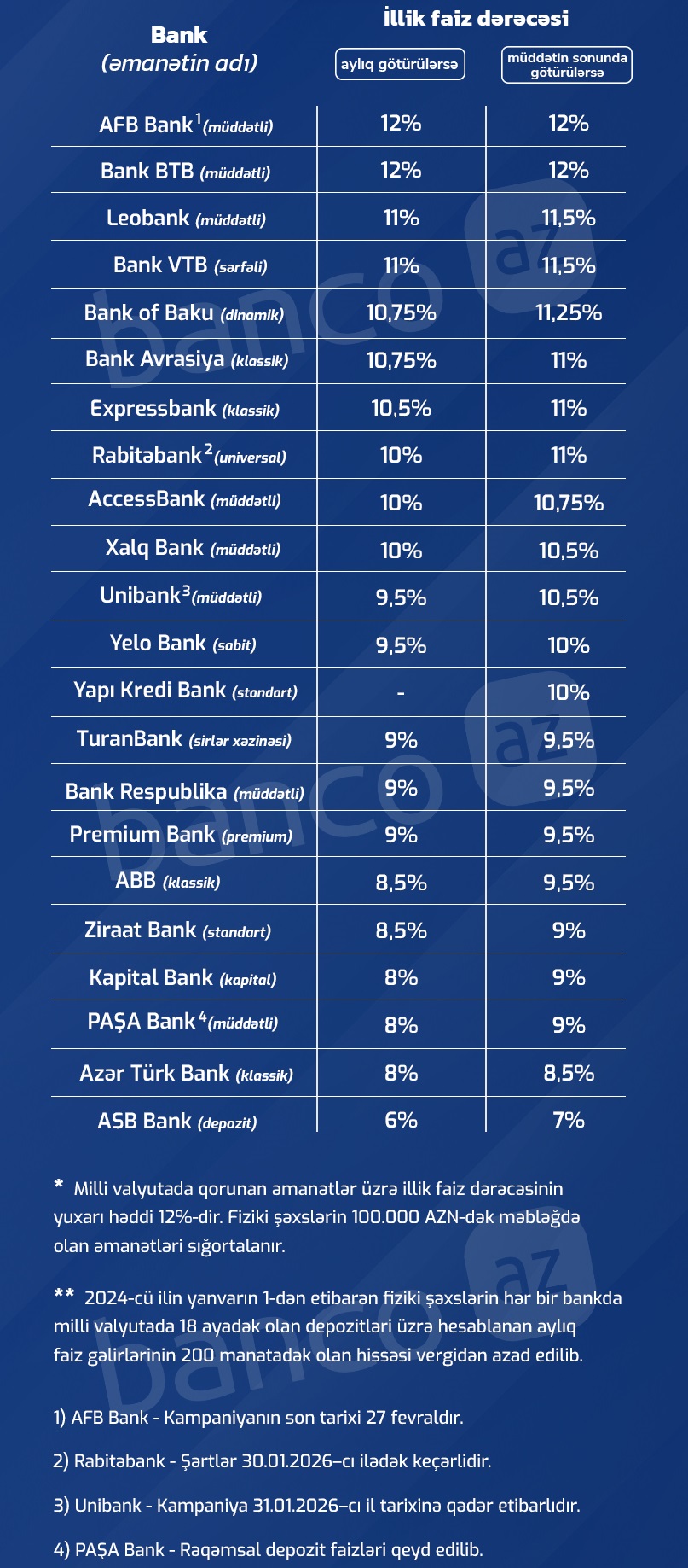 Modern.az xəbər verir ki, Banco.az-ın araşdırmasına görə, hazırda yalnız 2 bank - AFB Bank və Bank BTB depozitlər üçün aylıq və müddətin sonunda 12% gəlirlilik təklif edir.