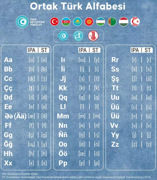 Modern.az-ın məlumatına görə, Ortaq Türk Əlifbası 34 hərfdən ibarətdir. Türk Dövlətləri Təşkilatı (TDT) tərəfindən yaradılan Türk Dünyası Ortaq Əlifba Komissiyası Ortaq Türk Əlifbasını ötən ilin sentyabrında Bakıda razılaşdırıblar.