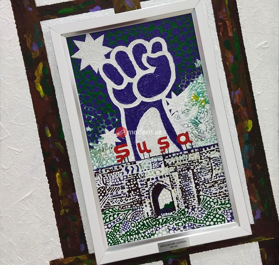 “Xüsusilə müzəffər ordumuzun Ali Baş Komandanı tərəfindən səsləndirilən “Dəmir yumruq” və “Əziz Şuşa, sən azadsan!” ifadələri rəssamların təsəvvüründə yeni bədii dil formalaşdırmışdır. Bu mənada Xalq rəssamı Arif Əzizin və Səmədağa Cəfərovun “Əziz Şuşa, sən azadsan!” (2020), Əməkdar rəssam Vüqar Əlinin “Zəfər” (2020), Samir Qafarovun “Dəmir yumruq” (2021) əsərləri xüsusilə qeyd edilməlidir. Bu əsərlərdə “Dəmir yumruq” obrazı torpaqların azadlığı uğrunda mübarizəyə qalxan xalqın birliyini, mənəvi qüdrətini və sarsılmaz iradəsini simvolizə edir. Realist və ümumiləşdirilmiş yanaşmanın sintezi bu əsərlərə həm tarixi sənədlik, həm də yüksək emosional təsir gücü bəxş etmişdir”.