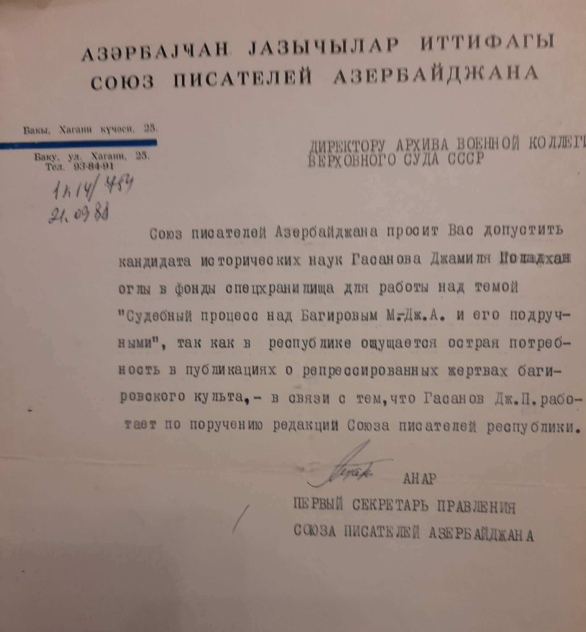 Anar müəllim 1988-ci ilin sentyabr ayının 21-də qeyd edilən Arxivdə Bağırovun sənədləri ilə tanış olmaq üçün SSRİ Ali Məhkəməsi Hərbi Kollegiyası Arxivinin direktorunun adına məktub verdi. Mən Moskvaya getdim. Lakin Hərbi Kollegiyanın Arxivində Bağırovun sənədləri ilə işləməyə icazə vermədilər. Dedilər ki, sənədlər qapalı fonddadır”.