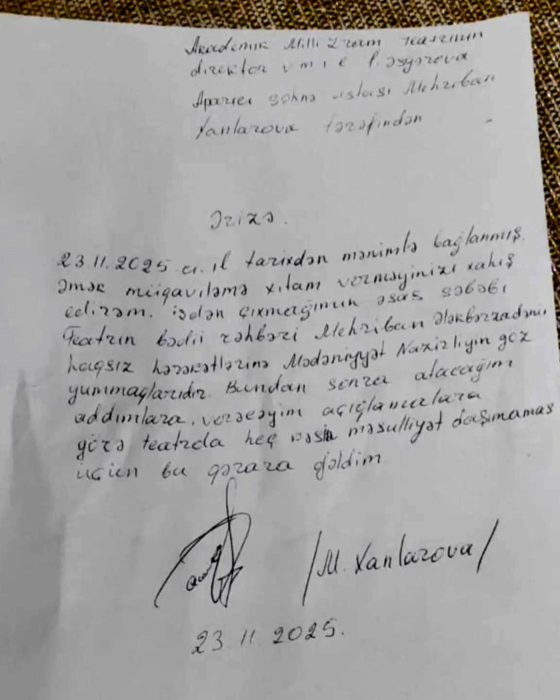 Akademik Dövdət Milli Dram Teatrının aktrisası, Əməkdar artist Mehriban Xanlarova işdən çıxmaq üçün ərizə yazıb.