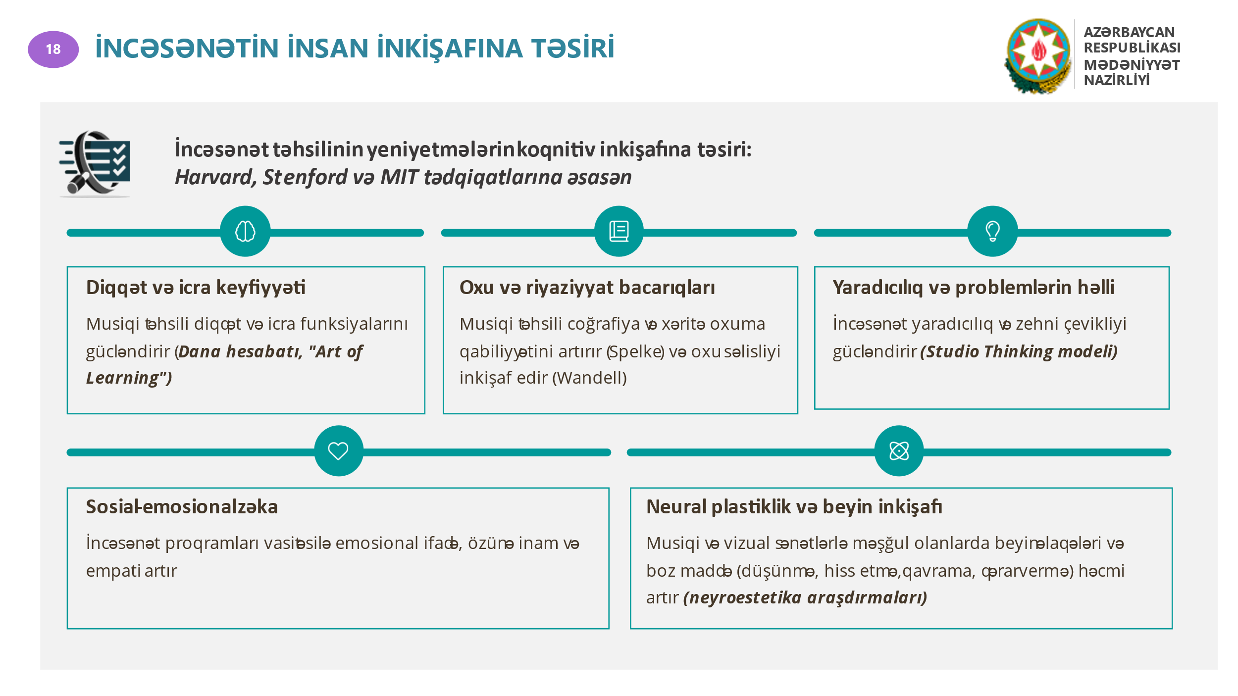 İncəsənət təkcə sənət deyil, həm də sosial-emosional keyfiyyətdir, yaradıcı düşünmə bacarığıdır. Artıq biz bu fərqi tam diqqətə alaraq, süni zəkanın gələcəyi daha çox dizayn edəcəyi mərhələdə incəsənətin önəmini daha dərindən anlamalıyıq. Bu mövzuda mədəniyyət təshilinin üzərinə xüsusi missiya düşür. Necə deyərlər, təhsil insan yaradıcılığı sənətidir.