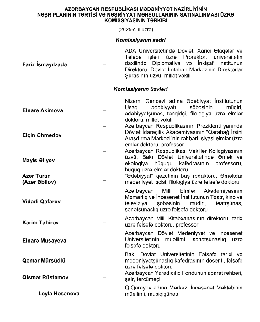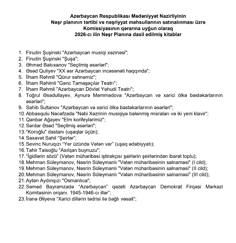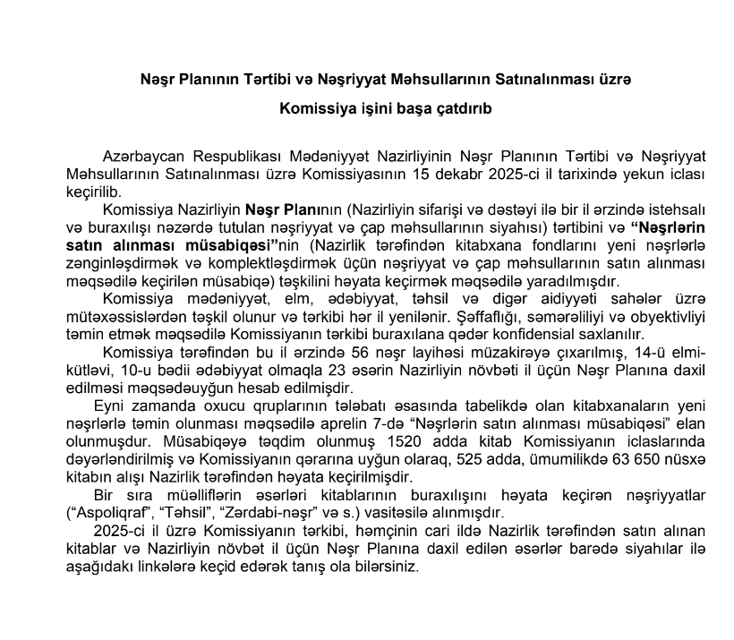2025-ci il üzrə Komissiyanın tərkibi, həmçinin cari ildə Nazirlik tərəfindən satın alınan kitablar və Nazirliyin növbət il üçün Nəşr Planına daxil edilən əsərlər barədə siyahıları təqdim edirik: