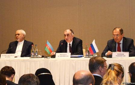 “7 aprel 2016-cı il tarixində Bakı şəhərində Azərbaycan Respublikasının, İran İslam Respublikasının və Rusiya Federasiyasının xarici işlər nazirləri cənab Elmar Məmmədyarov, cənab Məhəmməd Cavad Zərif və cənab Sergey Lavrovun görüşü keçirilib. Görüşün yekununda tərəflər ölkələrin regional və beynəlxalq məsələlər üzrə dialoq və qarşılıqlı fəaliyyətinin dərinləşdirilməsinə töhfə verəcək xarici işlər nazirlərinin üçtərəfli formatda görüşünün vacibliyini vurğuladılar.