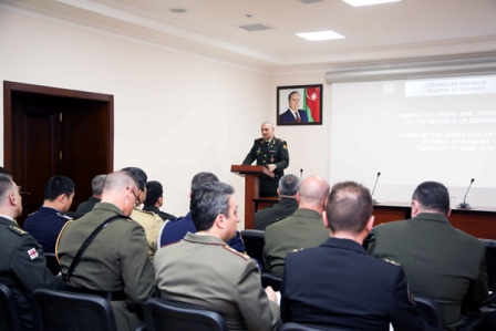 Müdafiə Nazirliyinin Beynəlxalq Hərbi Əməkdaşlıq İdarəsində xarici dövlətlərin Azərbaycan Respublikasındakı səfirlikləri nəzdində fəaliyyət göstərən hərbi attaşeləri, Hərbi Attaşelik aparatlarının, eləcə də beynəlxalq təşkilatların (BMT, Avropa İttifaqı və Beynəlxalq Qızıl Xaç Komitəsi) nümayəndələri üçün "Aprelin 1-dən 7-dək qoşunların təmas xəttində yerləşən Azərbaycanın yaşayış məntəqələrinə və vətəndaşlarına qarşı erməni bölmələrinin təxribat fəaliyyətləri"nə dair brifinq keçirilib.