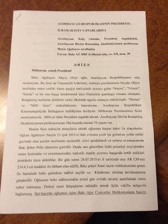 Meydan TV-nin rəhbəri Emin Millinin qayınatası, tanınmış xalq rəssamı Mayis Ağabəyov prezident İlham Əliyevə oğlu Nazim Ağabəyovun həbsi ilə bağlı müraciət edib. Modern.az saytı xəbər verir ki, müraciətin bir nüsxəsini “Qafqazinfo”ya göndərən Mayis Ağabəyov Emin Millinin Azərbaycan dövlətinin əleyhinə kampaniya apardığını və kürəkəninin fəaliyyətini yaramaz olduğunu bildirib: