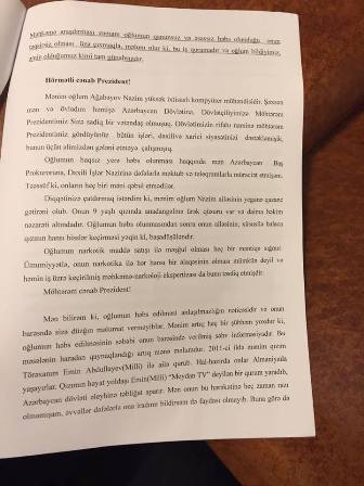 Sizə yeganə bir xahişlə müraciət edirəm oğlum Nazimin Emin Millinin yaramaz hərəkətlərinə görə məhkum olmasına imkan verməyəsiniz, onun tezliklə azadlığa çıxmasına ailəsinə, xəstə övladına qovuşmasına yardımçı olasınız.