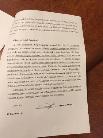 Siz Azərbaycan Respublikasında qanunçuluğun, hər bir vətəndaşın hüquqlarının qorunmasının qarantısınız. Mən də, oğlum da həmişə Sizin qayğınızı öz üzərimizdə hiss etmişik. Oğlum həbs ediləndən indiyə kimi ilk növbədə Ulu Öndər mərhum Heydər Əliyev cənabları və onun layiqli davamçısı olan möhtərəm Prezidentimiz sizin tərəfinizdən ümumiyyətlə mədəniyyətə və xüsusən də mənim əməyimə verilmiş yüksək qiyməti nəzərə alaraq oğlumun qanunsuz həbs edilməsinin ictimailəşməsinin əleyhinə olmuşam, bunun dövlətimizə baş ucalığı gətirməyəcəyini düşünmüşəm, bu gün də bu fikirdəyəm.