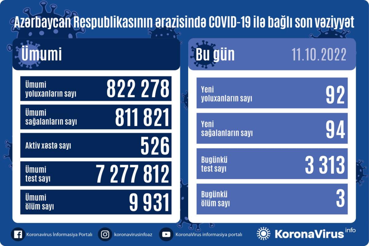 Azərbaycanda koronavirus (COVID-19) infeksiyasına 92 yeni yoluxma faktı qeydə alınıb, 94 nəfər müalicə olunaraq sağalıb.