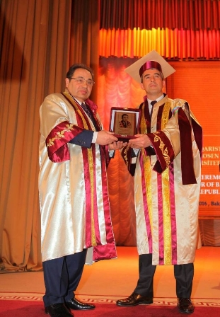 Bir sıra tarixi şəxsiyyətlərin BDU-nun fəxri doktoru olduğunu deyən rektor universitetin Elmi Şurasının iclasında Rosen Plevneliyevə BDU-nun fəxri doktoru adının verilməsi haqqında qərar qəbul edildiyini  nəzərə çatdırıb. Bolqarıstan Prezidenti “Dünyada sülhün qorunmasında, xalqlar arasında dostluq əlaqələrinin möhkəmləndirilməsində böyük roluna, Azərbaycan-Bolqarıstan  Respublikaları  arasında  qardaşlıq münasibətlərinin daha da inkişafında əvəzsiz xidmətlərinə, elm və təhsilin tərəqqisinə verdiyi dəstəyə  görə” Bakı Dövlət Universitetinin fəxri doktoru adına layiq görülüb.