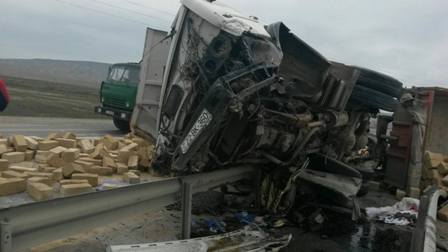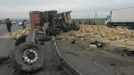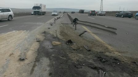 “Azəravtoyol” ASC-dən Modern.az-a  verilən məlumata görə, “Kamaz” markalı 22 BC 360 dövlət nömrə nişanlı qoşqulu yük maşını Bakı şəhəri istiqamətində hərəkətdə olarkən yol ayrıcındakı əyri-xətli dəmir tirləri dağıdaraq, aşıb. Qəza zamanı 140 paqon metrə yaxın dəmir arakəsmə sıradan çıxıb və bununla da dövlət büdcəsinə ilkin hesablamalara əsasən 8 min manata yaxın ziyan dəyib.