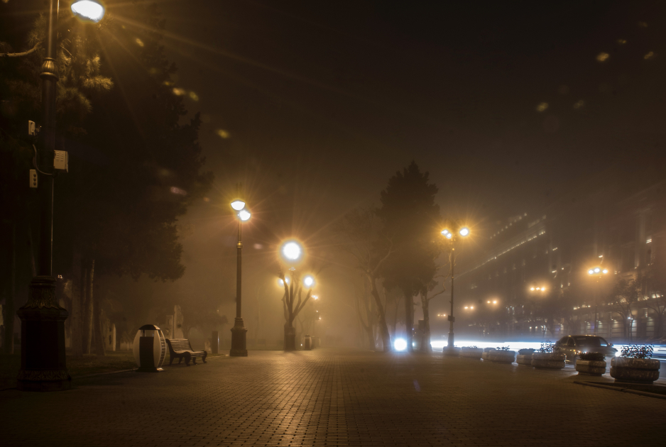 Səkilərdə addımlayan insanların silueti dumanı yarıb keçir. Küçələrdə asta-asta hərəkət edən avtomobillərin işıqları qaranlıq və dumanlı Bakı gecəsi ilə harmoniya yaradır. Bu gecə şəhər bir başqadır, bu gecə yorğun və yuxulu Bakı sanki dincəlir...