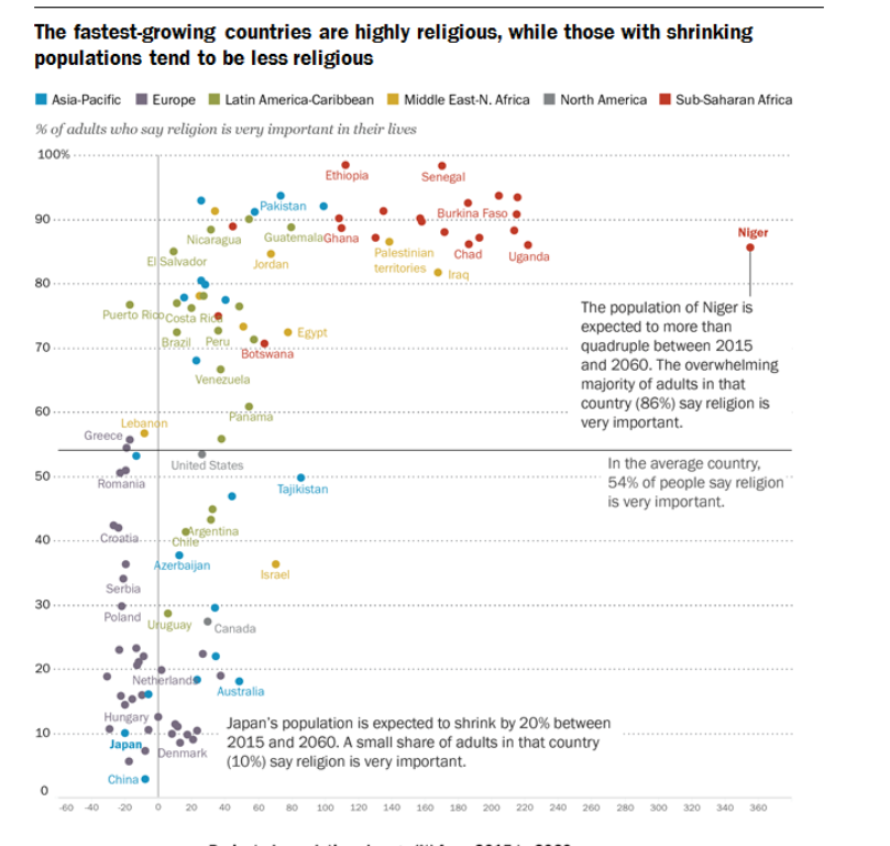 Qlobal orta göstəriciyə əsasən, ölkələrin əksəriyyətində əhalinin 54 faizi dini həyatında “çox vacib” hesab edir. Lakin bu göstərici demoqrafik dinamika ilə birbaşa əlaqəlidir. Qrafikin sağ yuxarı hissəsində yerləşən Niger, Efiopiya, Seneqal, Burkina Faso, Uqanda, Çad kimi ölkələrdə əhali artımı yüksəkdir və bu ölkələrdə dini “çox vacib” sayanların payı 80–90 faiz aralığında dəyişir.