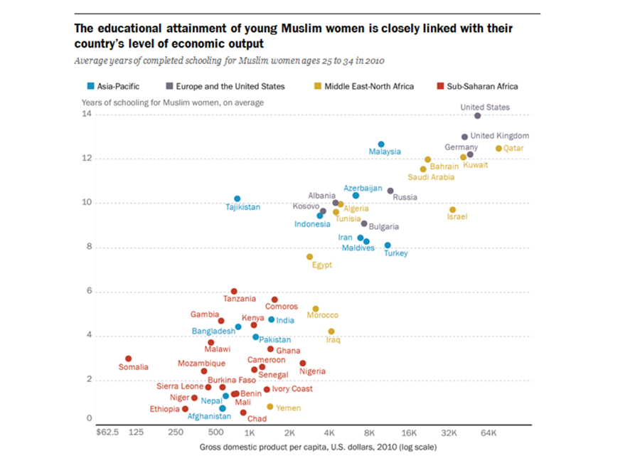 Müsəlman qadınların təhsil səviyyəsi ilə ölkənin iqtisadi inkişaf göstəriciləri arasında birbaşa əlaqəni göstərən qrafikdə isə xüsusilə 25-34 yaş aralığında olan müsəlman qadınların orta təhsil müddəti ölkələrin adambaşına düşən ÜDM səviyyəsi artdıqca yüksəlir. Yəni iqtisadi imkanlar genişləndikcə qadınların təhsilə çıxışı da sistemli şəkildə artır.
