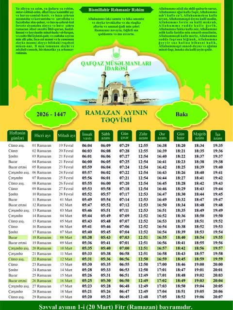 Modern.az xəbər verir ki, imsak vaxtı 05:56-ya, iftar isə 18:41-ə təyin olunub.