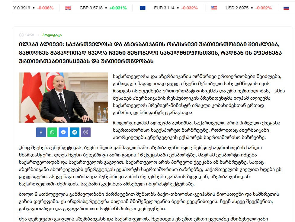 “Primitime.ge” yazır ki, Azərbaycan Prezidentinin çıxışında iki ölkə arasında münasibətlərin daha dinamik şəkildə inkişafından məmnunluq ifadə olunub. Bildirilir ki, Azərbaycan və Gürcüstan bütün beynəlxalq təşkilatlarda bir-birinin ərazi bütövlüyünü, suverenliyini və sərhədlərin toxunulmazlığını dəstəkləyir. Bu, hər zaman belə olub və gələcəkdə də belə olacaq.